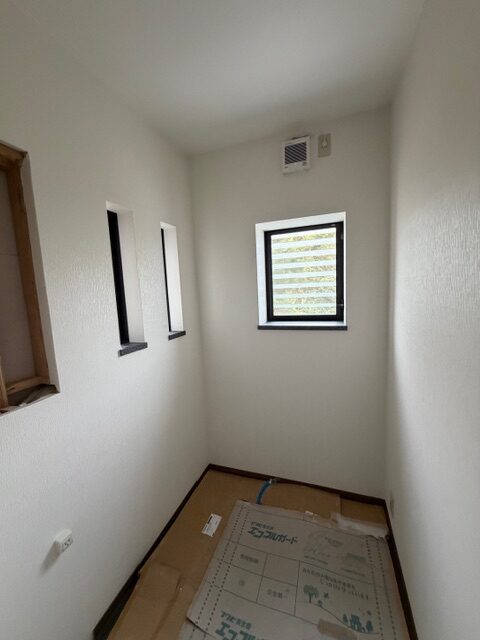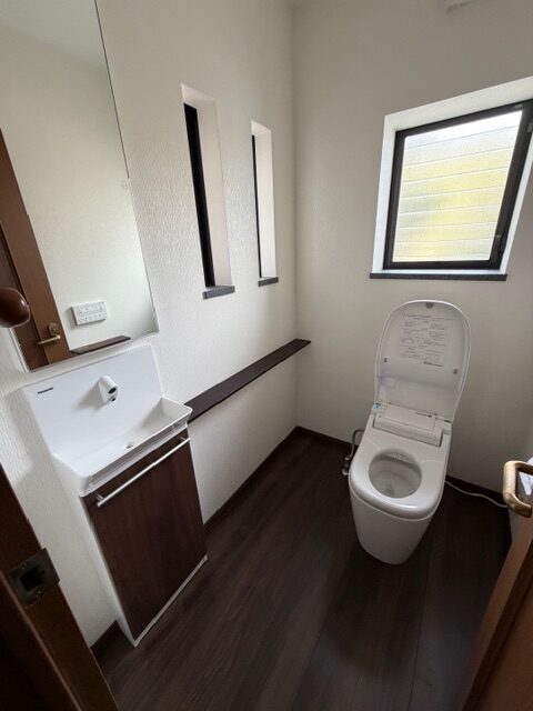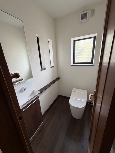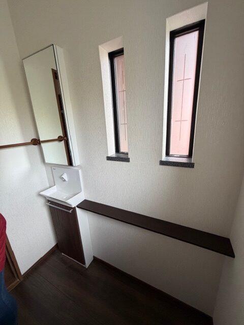 には鏡付きの収納庫を埋込ます。トイレット